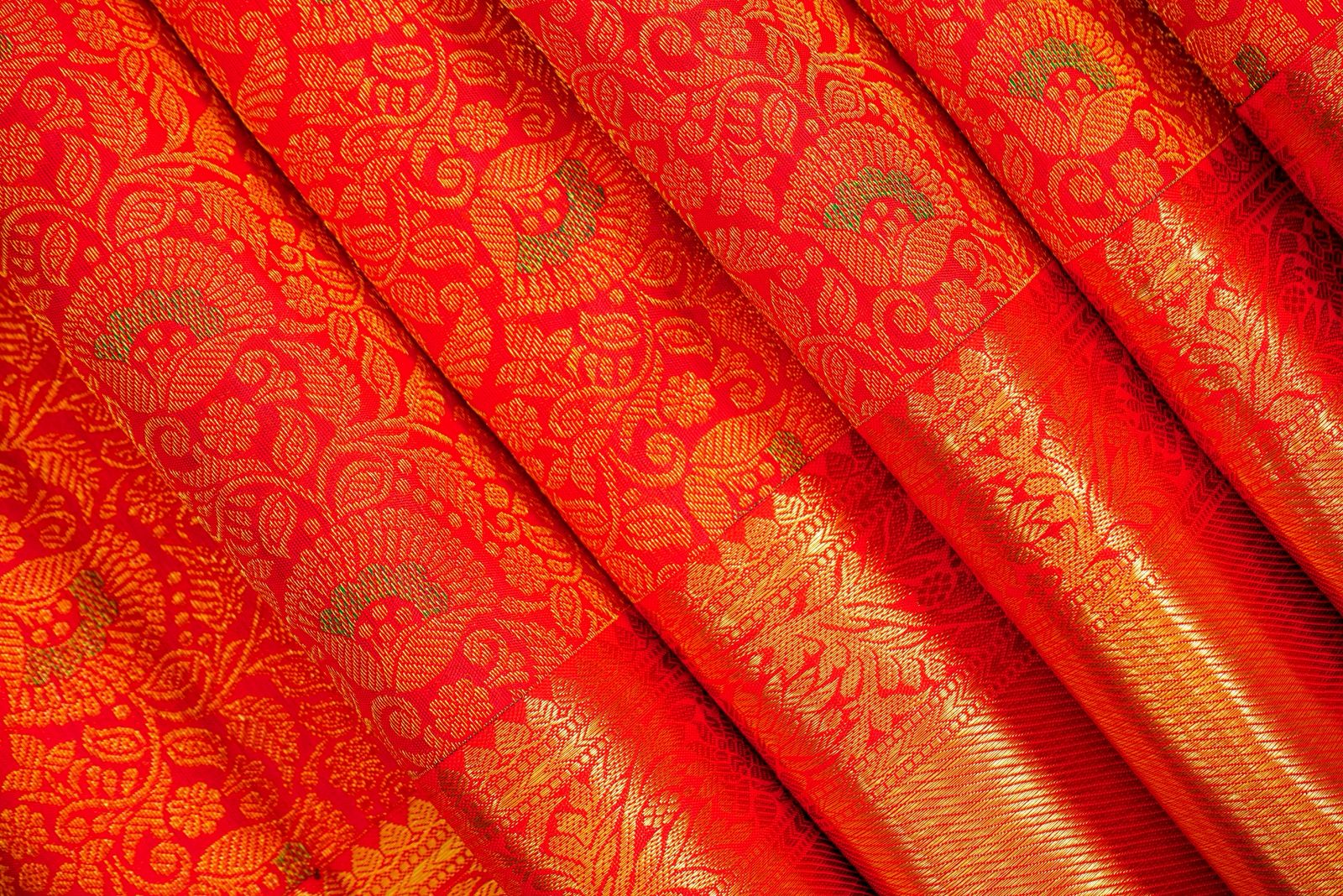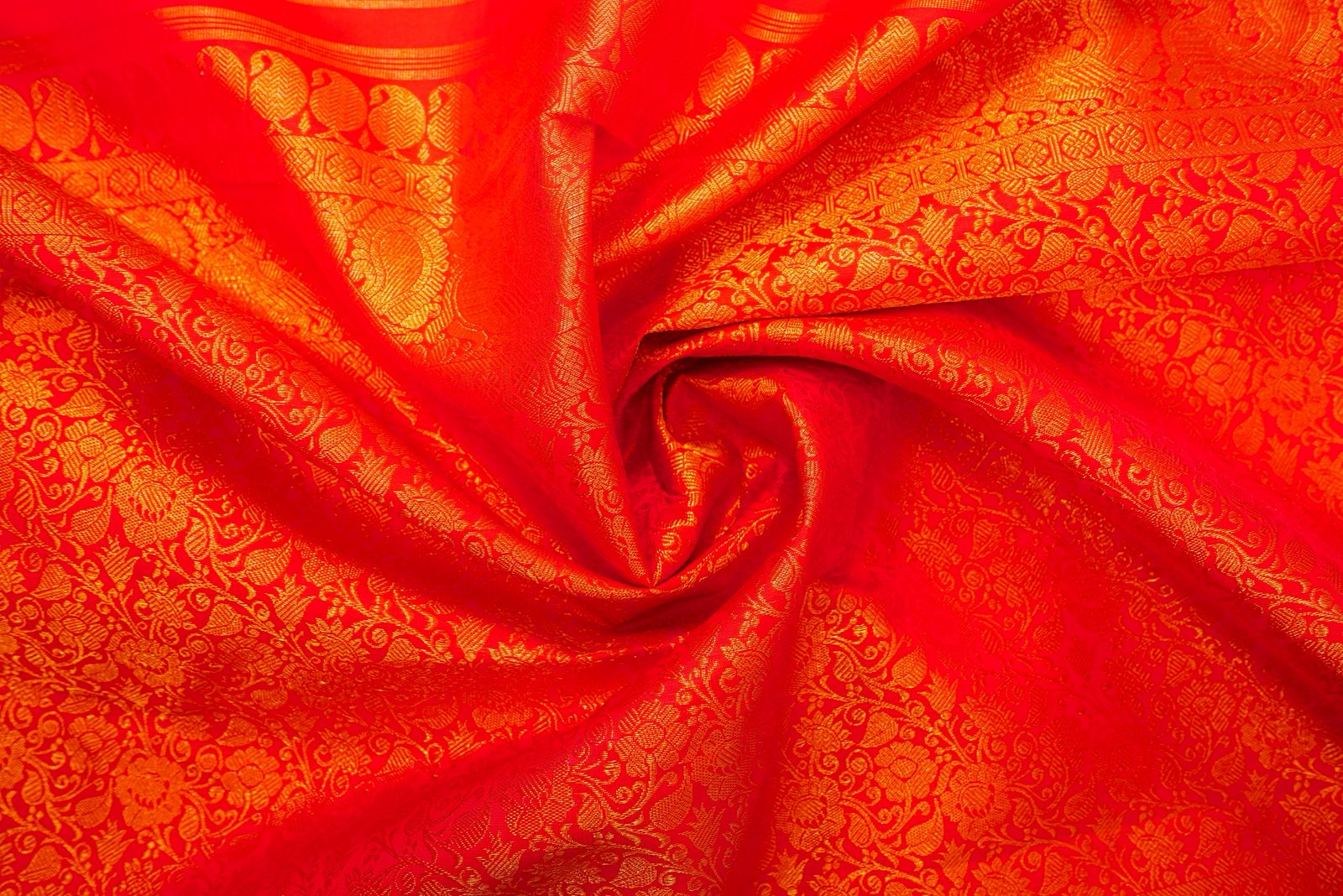 This Kanjivaram saree is a fiery celebration of tradition, glowing in vibrant vermilion red with exquisite gold zari work. The body is adorned with intricate floral vines and paisley motifs, while the pallu and borders shimmer with grandeur, woven to perfection. Richly textured and luxurious in feel, this masterpiece embodies timeless elegance and festive opulence, making it an irresistible choice for weddings and auspicious occasions.