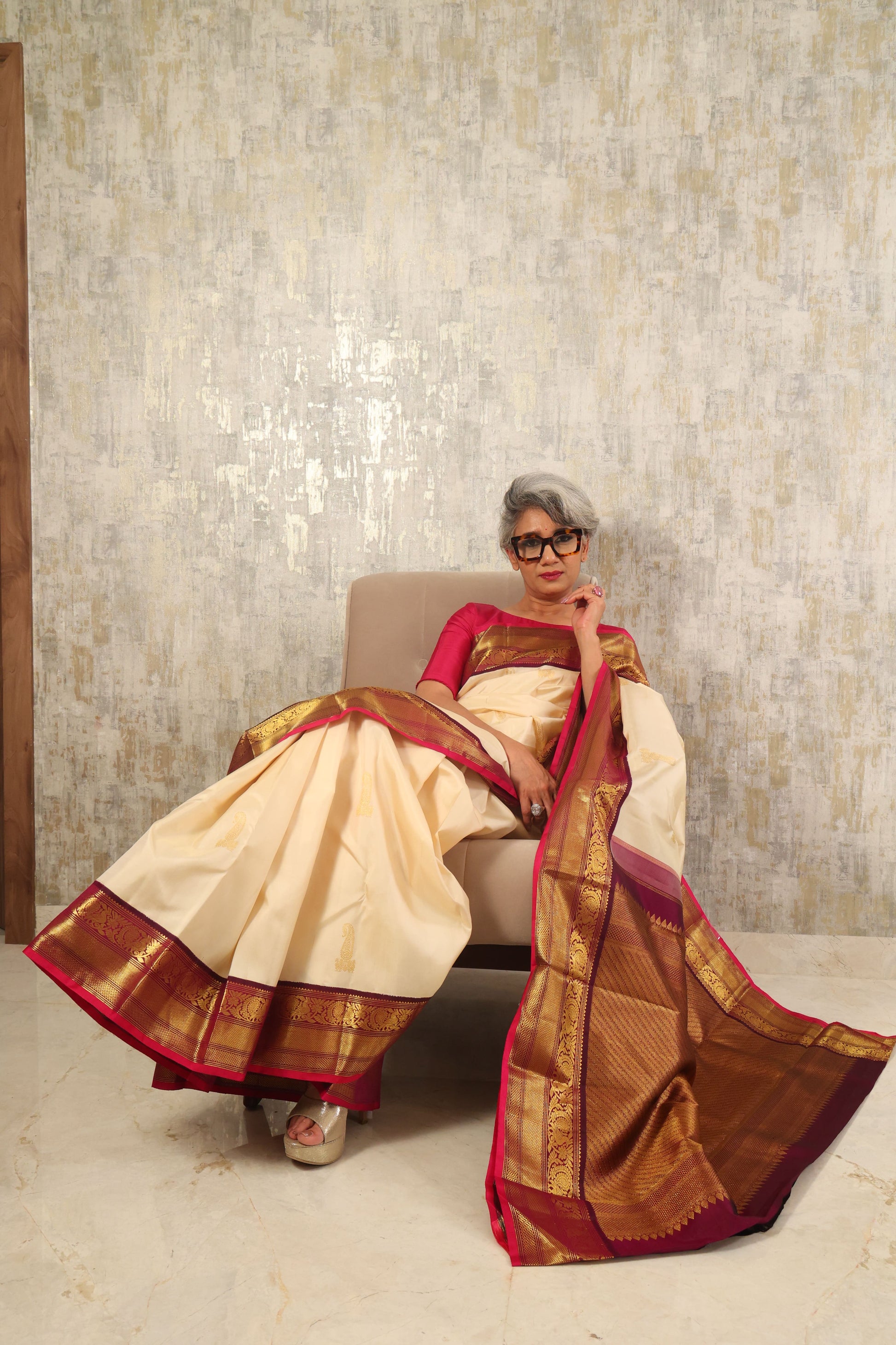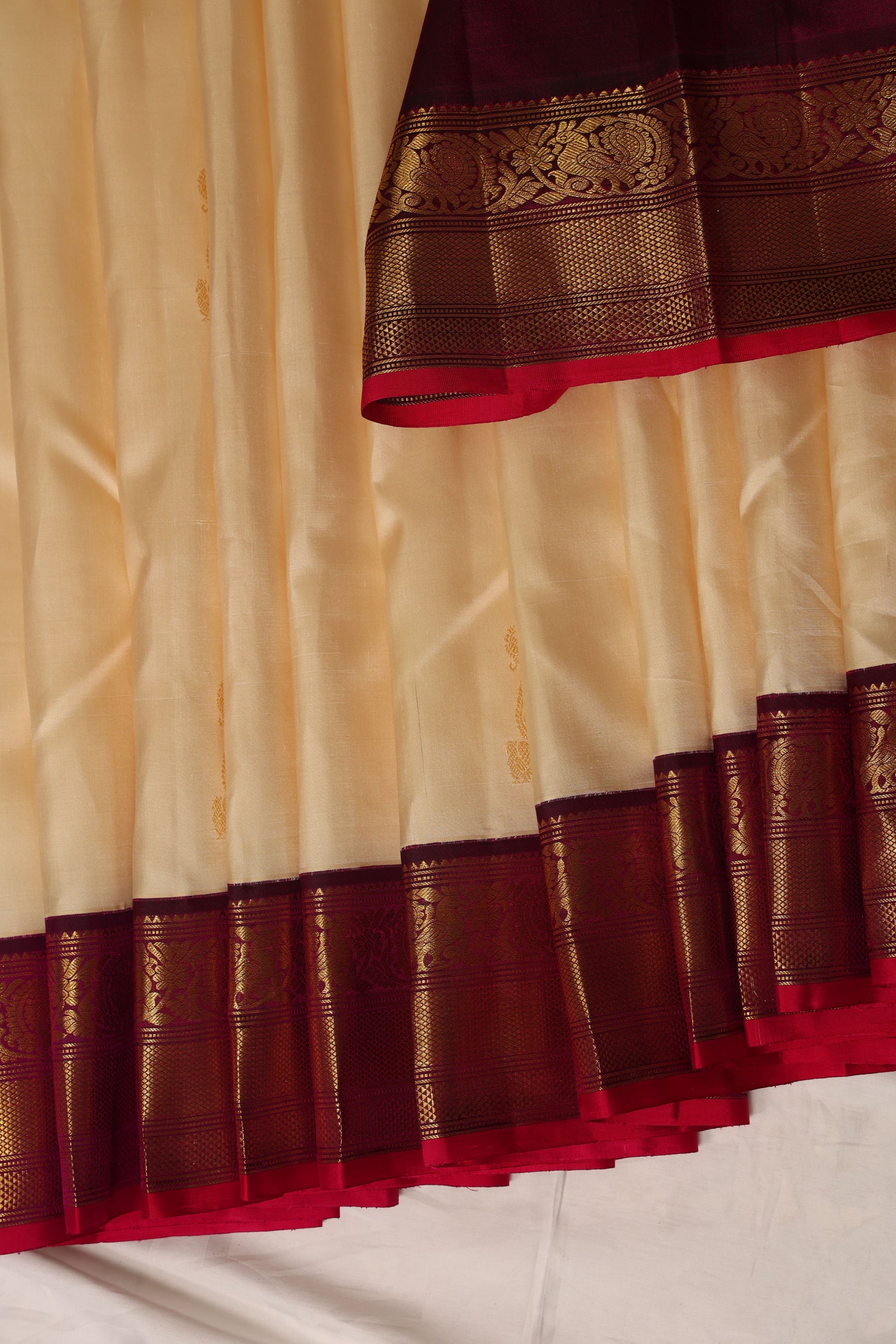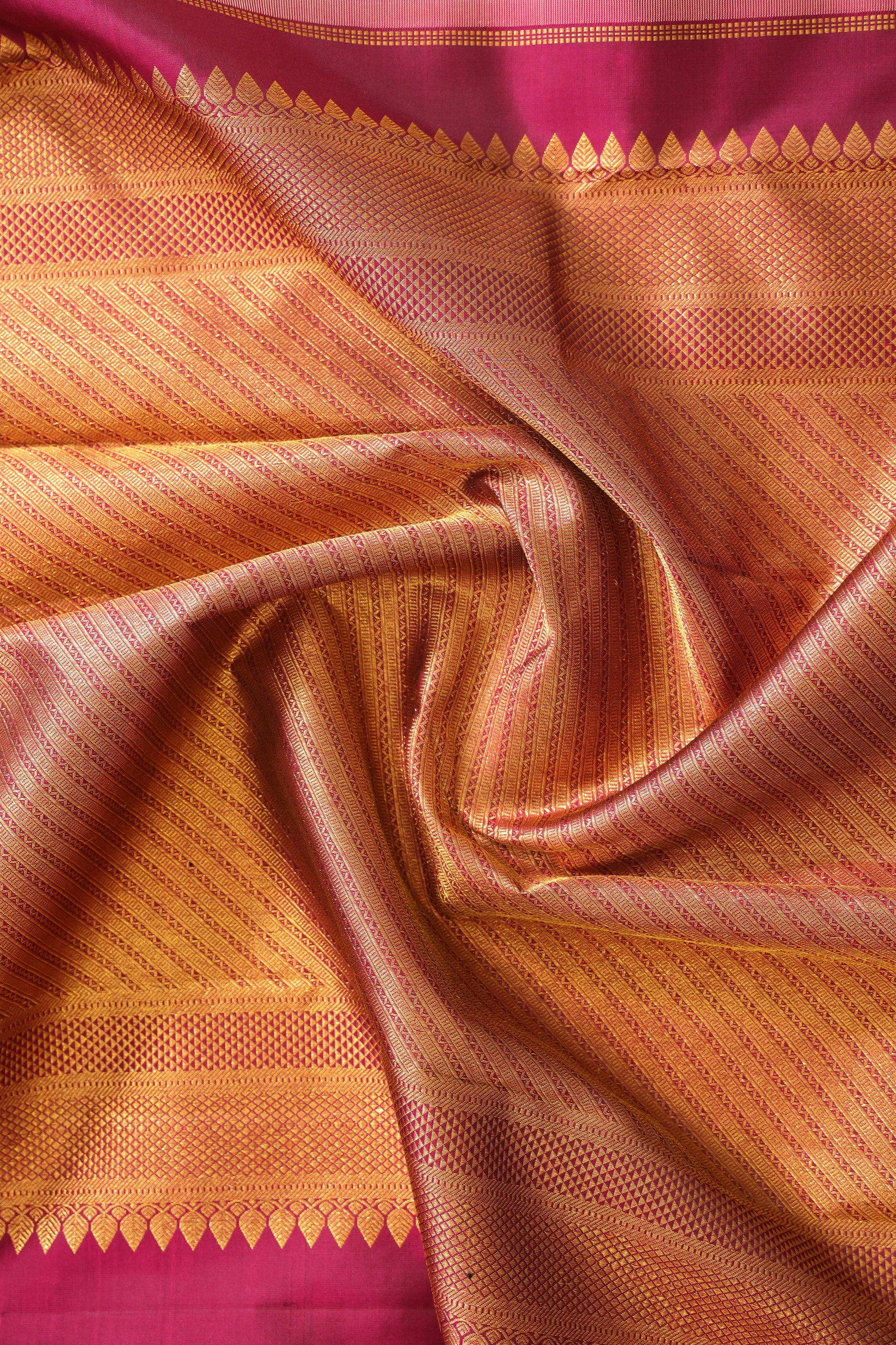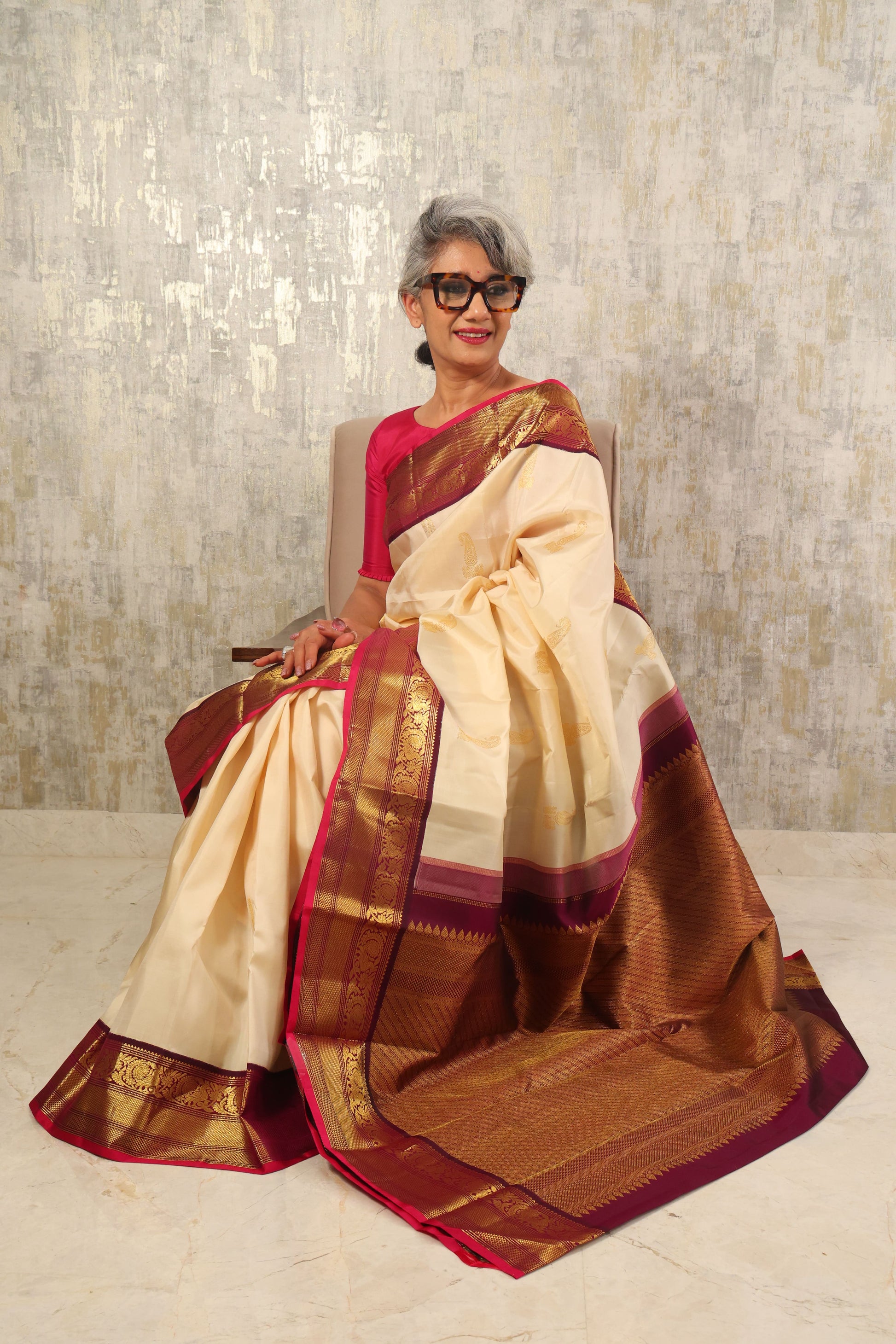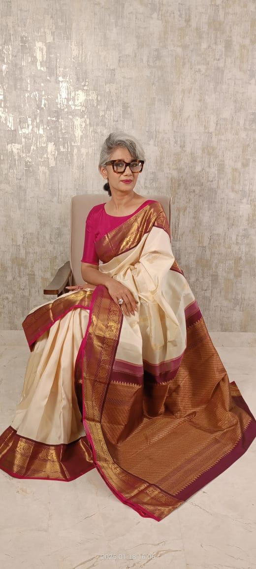 This Silk Handloom Kanjivaram Saree features a luxurious off-white base with a rich purple pink and gold border, adorned with intricate golden zari work. It exedues elegance and tradition. Its regal drape and intricate craftsmanship make it a timeless masterpiece.